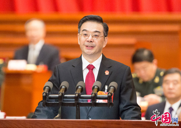 Zhou Qiang, president of China's Supreme People's Court (SPC), delivers the work report of the Supreme People's Court (SPC) to the national legislature at the ongoing annual sessionat the Great Hall of the People in Beijing, March 12, 2015. [Photo/china.com.cn] |