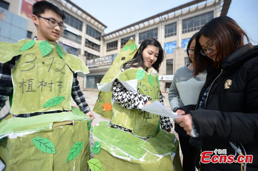 University students wearing creations made of newspapers, paper bags and other waste materials hand out leaflets during an event in Yangzhou, East China’s Jiangsu province, March 11, 2015. The event aimed to promote public awareness of environmental protection and introduce knowledge of afforestation ahead China’s national Tree Planting Day celebrated on March 12 each year.(Photo: China News Service/Meng Delong) |