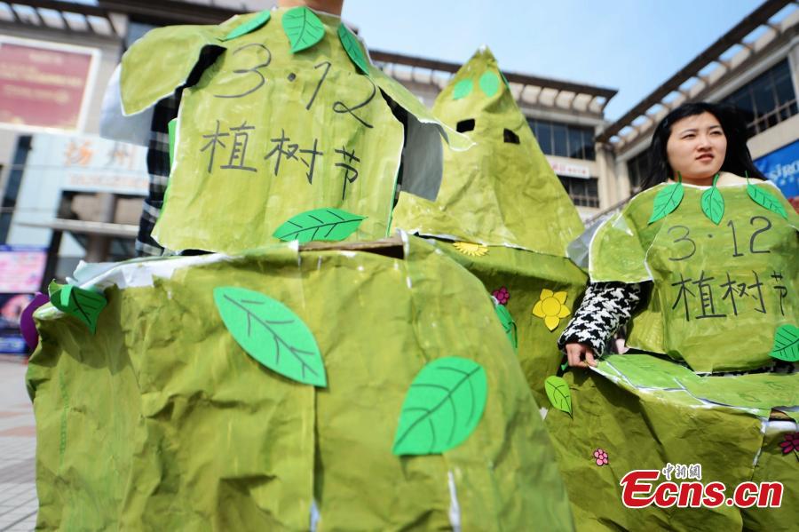 University students present creations made of newspapers, paper bags and other waste materials during an event in Yangzhou, East China’s Jiangsu province, March 11, 2015. The event aimed to promote public awareness of environmental protection and introduce knowledge of afforestation ahead China’s national Tree Planting Day celebrated on March 12 each year.(Photo: China News Service/Meng Delong) |
