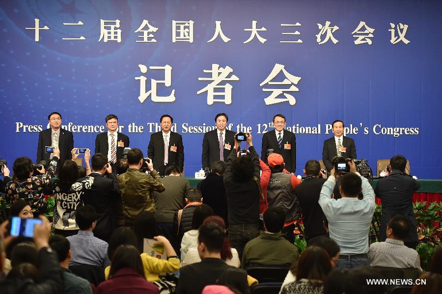Xie Heping, Shen Jian, Luo Weiqi, Li Jianbao, Zheng Qiang, five deputies to the 12th National People's Congress (NPC), give a press conference about China's higher education during the third session of the 12th NPC in Beijing, capital of China, March 13, 2015. (Xinhua/Li Ran) |