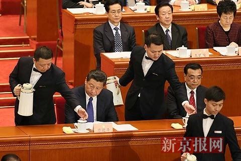 Waiters serve tea to the leaders in the first two rows, which is unprecedented, during the "two sessions" in 2015. [Photo/Beijing News]