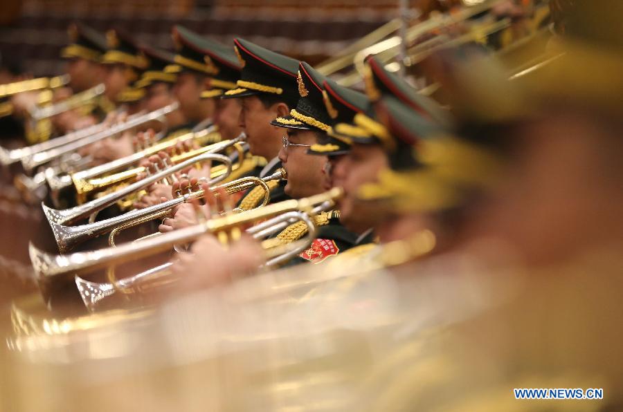 A military band plays the national anthem during the closing meeting of the third session of the 12th National Committee of the Chinese People's Political Consultative Conference (CPPCC) at the Great Hall of the People in Beijing, capital of China, March 13, 2015. (Xinhua/Xing Guangli) |