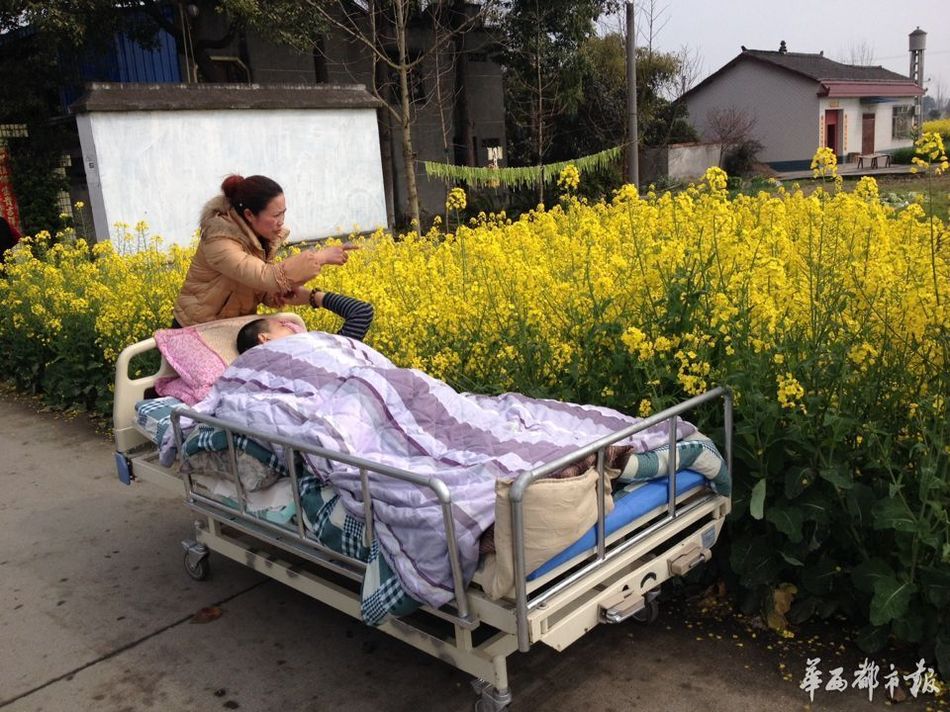 A woman takes her paralyzed husband in a movable sickbed to appreciate rape flowers in Deyang, southwest China's Sichuan province. The story was reported by the West China City Daily, a local newspaper on March 11, 2015. (Photo/WCCDaily)