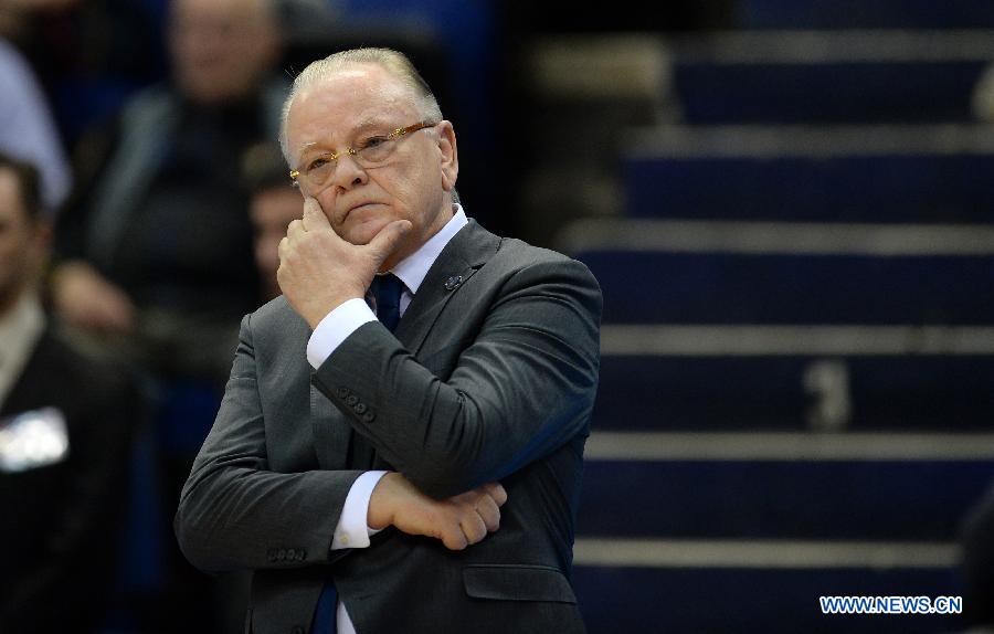Dusan Ivkovich, head coach of Turkey's Anadolu Efes Istanbul, reacts during the Basketball Euroleague match against Russia's CSKA Moscow in Moscow, Russia, on March 13, 2015. CSKA won 88-83. (Xinhua/Pavel Bednyakov)