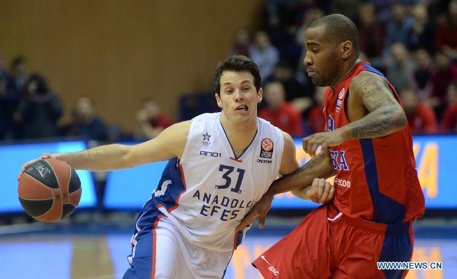 Aaron Jackson (R) of Russia's CSKA Moscow vies with Thomas Heurtel of Turkey's Anadolu Efes Istanbul during their Basketball Euroleague match in Moscow, Russia, on March 13, 2015. CSKA won 88-83. (Xinhua/Pavel Bednyakov)