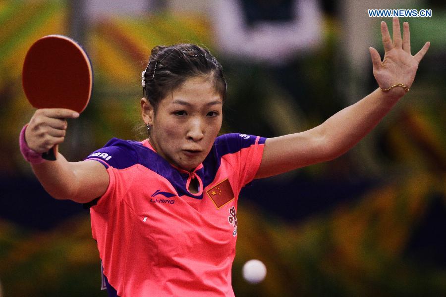 Liu Shiwen of China returns a ball during women's singles semifinal match against Zhu Yuling of China on the second day of the 28th Table Tennis Asian Cup in Jaipur, India, March 14, 2015. Liu Shiwen won 4-2. (Xinhua/Zheng Huansong)