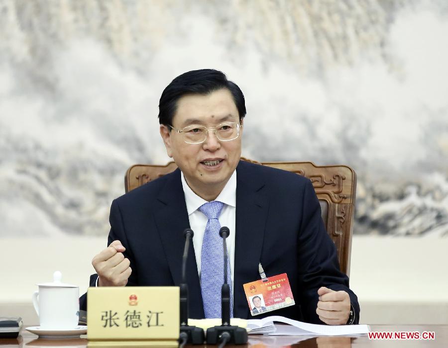 Zhang Dejiang, executive chairperson of the presidium of the third session of China's 12th National People's Congress (NPC) and chairman of the NPC Standing Committee, presides over the second meeting of the presidium's executive chairpersons at the Great Hall of the People in Beijing, capital of China, March 14, 2015. (Xinhua/Lan Hongguang) |
