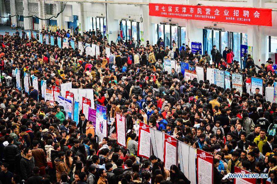 Job seekers attend a job fair held for fresh graduates in east China's Tianjin, March 14, 2015. About 1,800 opportunities were offered at the fair. (Xinhua/You Sixing)