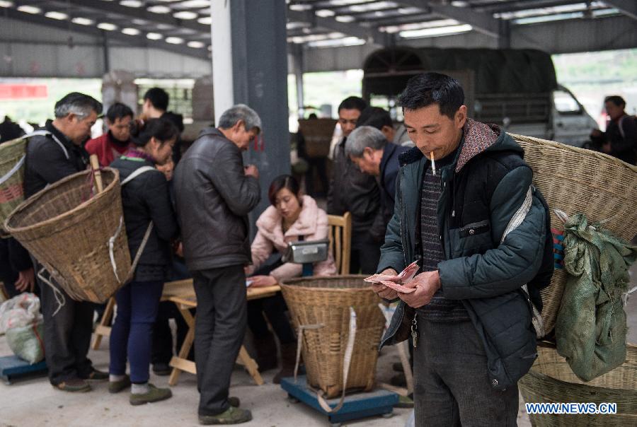 Tea farmers count money after selling fresh tea leaves at a market in Shuanghe Township in Ya'an City, southwest China's Sichuan Province, March 14, 2015. Tea makers are making tea with newly-picked tea leaves before the Qingming Festival, which falls on April 5 this year, as tea of this period of time is regarded to have a better taste. (Xinhua/Jiang Hongjing) |