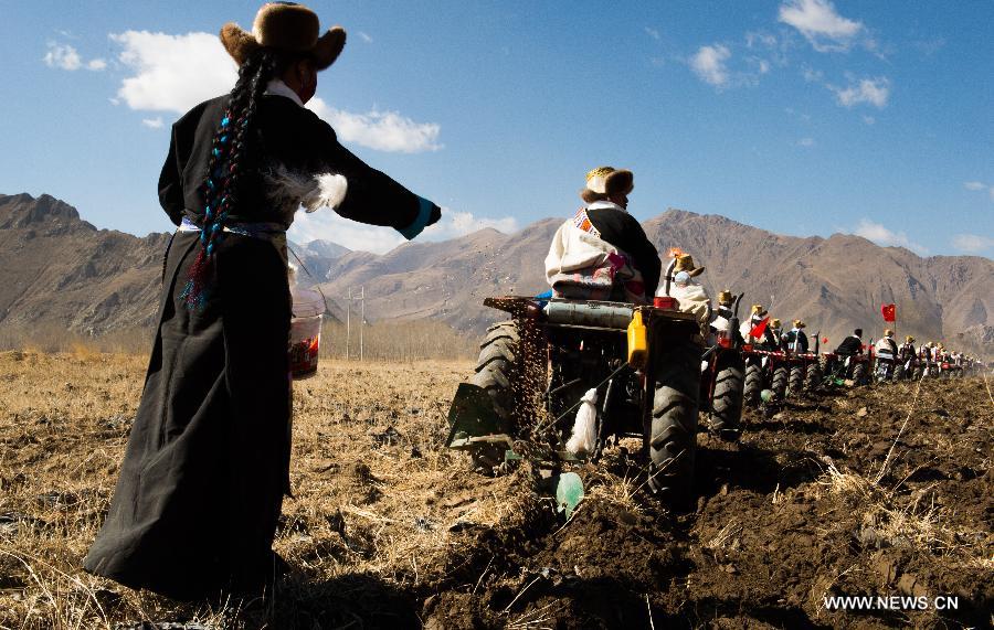 A woman casts seeds during a spring ploughing ceremony in Bomdoi Township in Dagze County, southwest China's Tibet Autonomous Region, March 16, 2015. Local farmers celebrated the traditional spring ploughing ceremony on March 16, the first day of spring ploughing in the lunar Tibetan calendar. The grain output of Tibet has witnessed a growth for five year in a row from 900,000 metric tons (tonnes) in 2009 to 985,000 tonnes in 2014. (Xinhua/Purbu Zhaxi) |