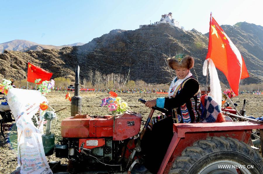 Female tractor driver Qoizong takes part in a spring ploughing ceremony in Zetang Coungy of Shannan Prefecture, southwest China's Tibet Autonomous Region, March 16, 2015. Local farmers celebrated the traditional spring ploughing ceremony on March 16, the first day of spring ploughing in the lunar Tibetan calendar. The grain output of Tibet has witnessed a growth for five year in a row from 900,000 metric tons (tonnes) in 2009 to 985,000 tonnes in 2014. (Xinhua/Chogo) |