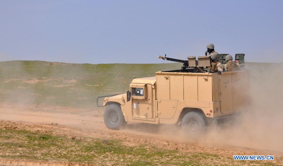 Afghan policemen patrol in Khush Tepa district of Jawzjan province in northern Afghanistan, March 16, 2015. (Xinhua/Arui)
