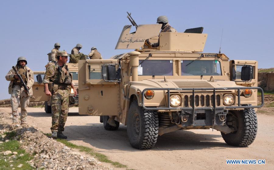 Afghan policemen patrol in Khush Tepa district of Jawzjan province in northern Afghanistan, March 16, 2015. (Xinhua/Arui)