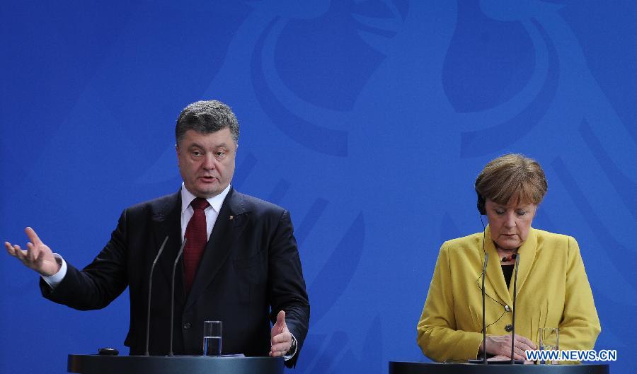 German Chancellor Angela Merkel (R) attends a press conference with Ukrainian President Petro Poroshenko in Berlin, Germany, March 16, 2015. Merkel on Monday promised Ukraine further assistance to achieve a peaceful solution in eastern regions of the country during a meeting with Ukrainian President Petro Poroshenko. (Xinhua/Shang Jing) |