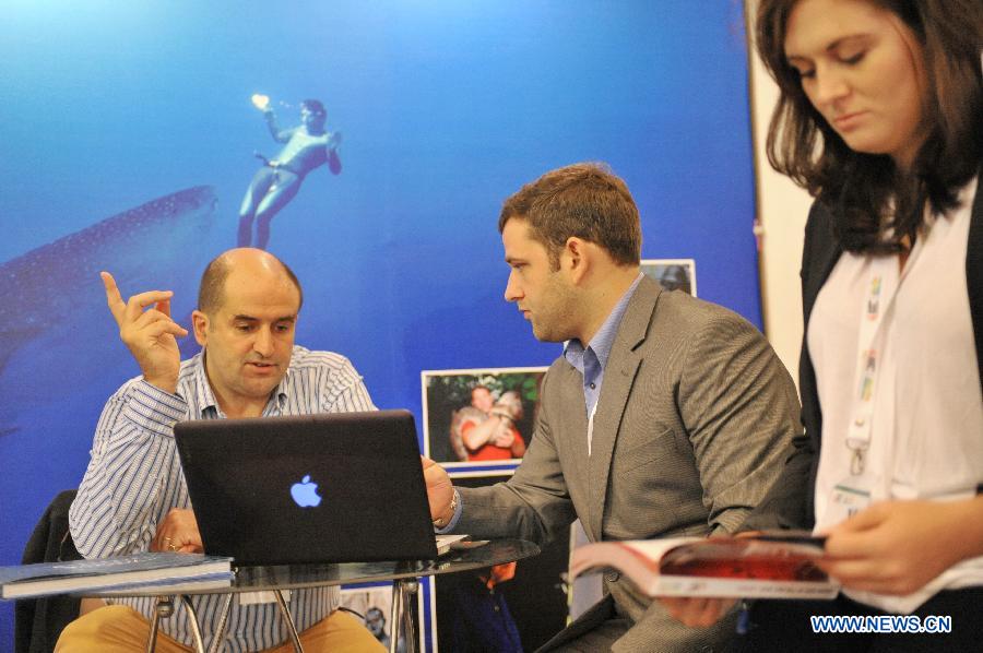 Simon Christopher (1st L), CEO of Malaysian SCUBAZOO, and underwater cameraman Oliver Deppert (C) discuss a documentary at the Asian Side of the Doc, in Xiamen, southeast China's Fujian Province, March 17, 2015. The fair will last from March 17 to 20 in Xiamen. (Xinhua/Lin Shanchuan)