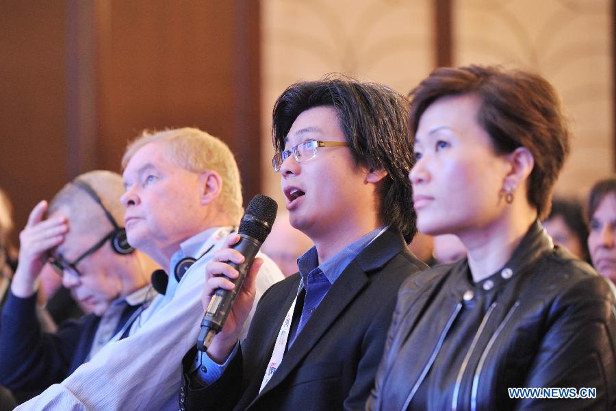 Kevin Ho (2nd R), a participant from Singaporean A&E Network, asks an question during a seminar at the Asian Side of the Doc, in Xiamen, southeast China's Fujian Province, March 17, 2015. The fair will last from March 17 to 20 in Xiamen. (Xinhua/Lin Shanchuan)