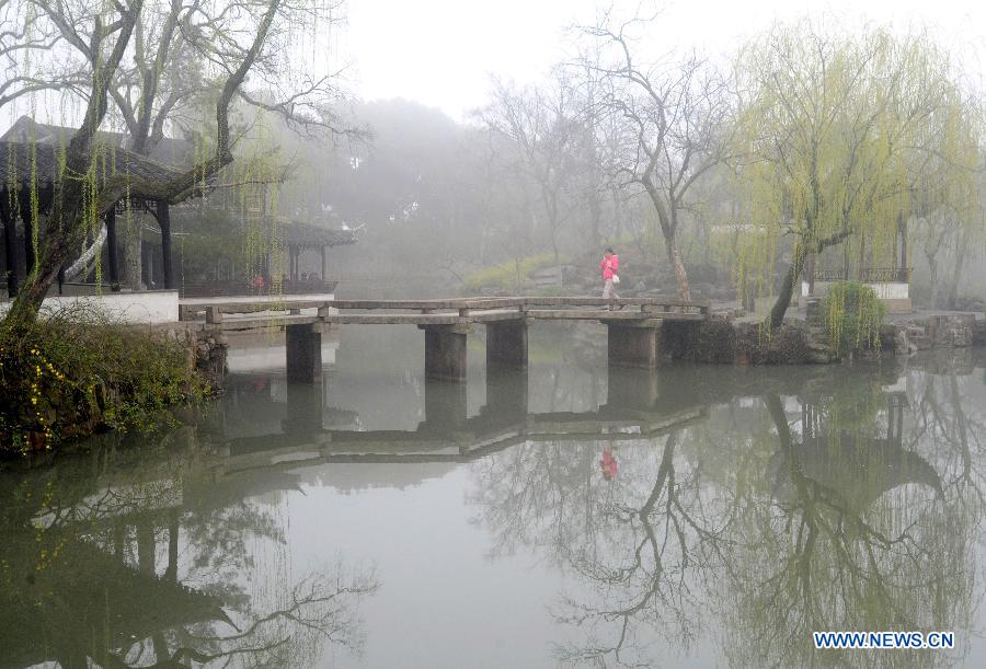 Photo taken on March 17, 2015 shows the Humble Administrator's Garden amid heavy fog in Suzhou City, east China's Jiangsu province. Heavy fog hit many areas of east China's Jiangsu province on Tuesday. (Xinhua/Hang Xingwei)