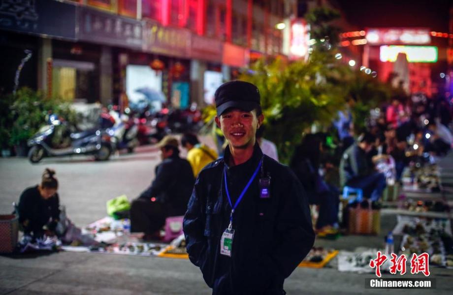 A security guard from Myanmar, 22, works in at the Delong jewelry market. He can speak some Chinese. To avoid war in Myanmar, he came to live near Ruili and later became a security guard at the night market with a month salary of more than 1000 yuan (160 USD). (CNS/Zhang Hao) |