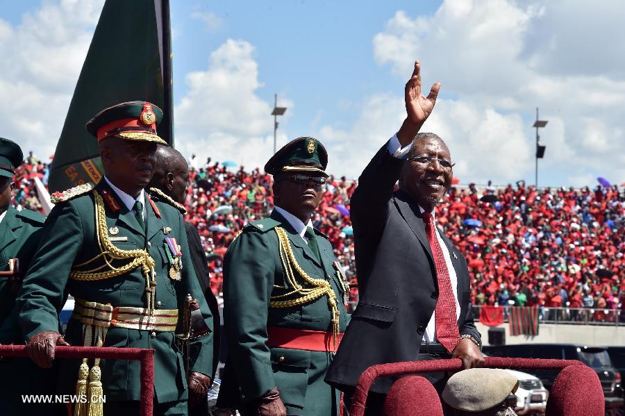 Lesotho's newly-elected Prime Minister Pakalitha Mosisili (front) waves to the spectators during the inauguration ceremony in Maseru, capital of Lesotho, on March 17, 2015. Lesotho's newly-elected Prime Minister Pakalitha Mosisili was inaugurated on Tuesday with a call for unity in the kingdom. (Xinhua/DOC/Elmond Jiyane)