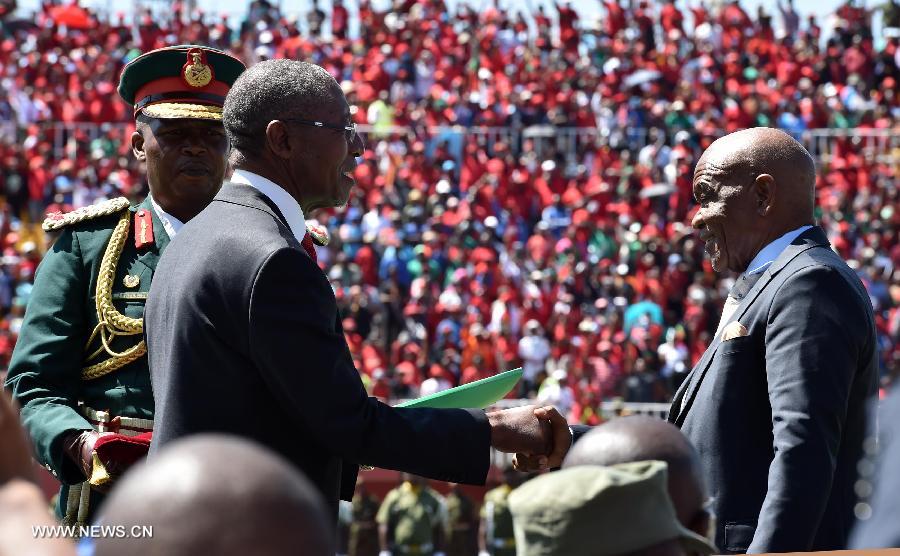 Lesotho's newly-elected Prime Minister Pakalitha Mosisili(C) shakes hands with the outgoing Prime Minister Thomas Thabane during the inauguration ceremony in Maseru, capital of Lesotho, on March 17, 2015. Lesotho's newly-elected Prime Minister Pakalitha Mosisili was inaugurated on Tuesday with a call for unity in the kingdom. (Xinhua/DOC/Elmond Jiyane) |