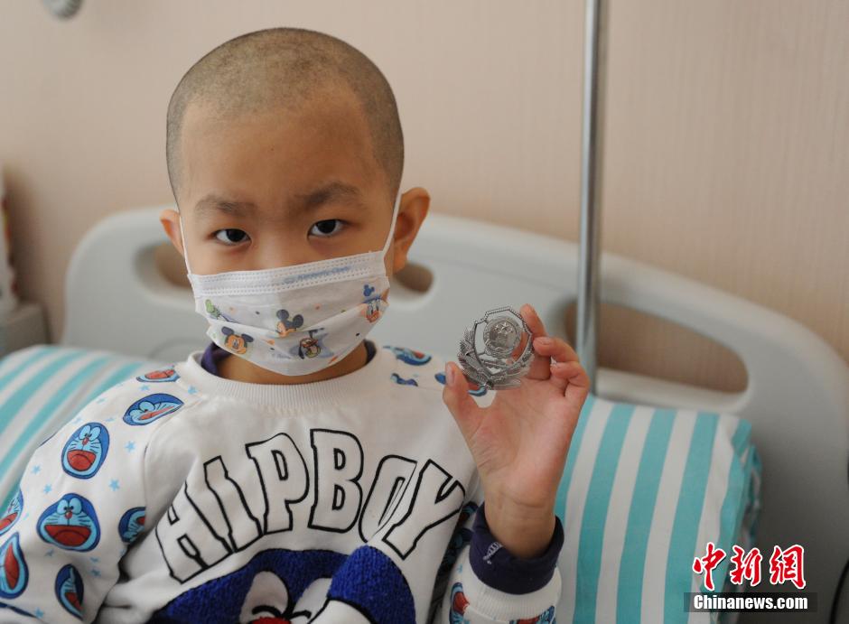 People come to the Bethune First Hospital of Jilin University to help Liu Zixi realize his police dream on March 16, 2015. (Chinanews/Zhang Yao)