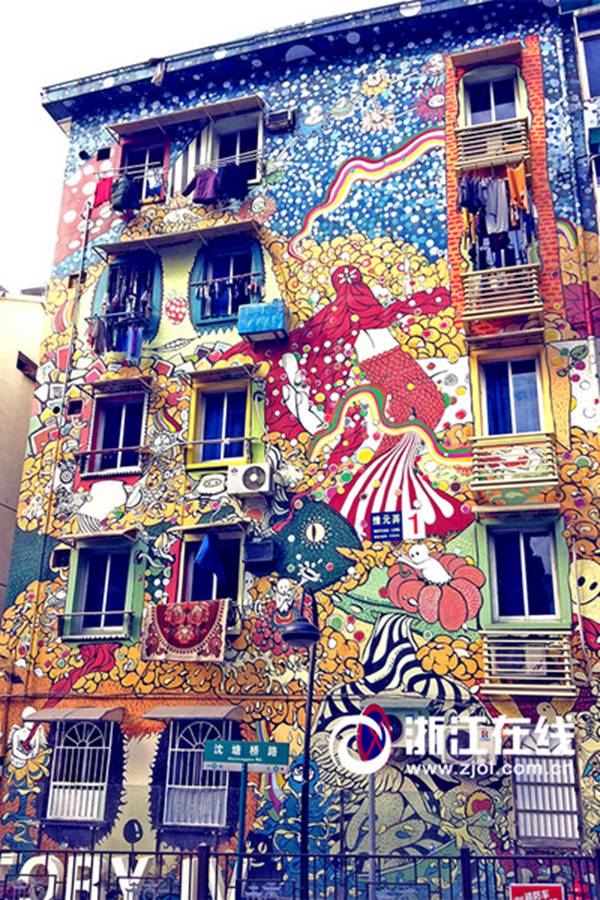 New graffiti on the walls of Youyong Alley in Hangzhou attract pedestrians’ attention and slow their steps down. The color splash on the walls gives people a reason to slow down and enjoy the beauty of life. (Zhejiang Online/Tong Xiaolei)