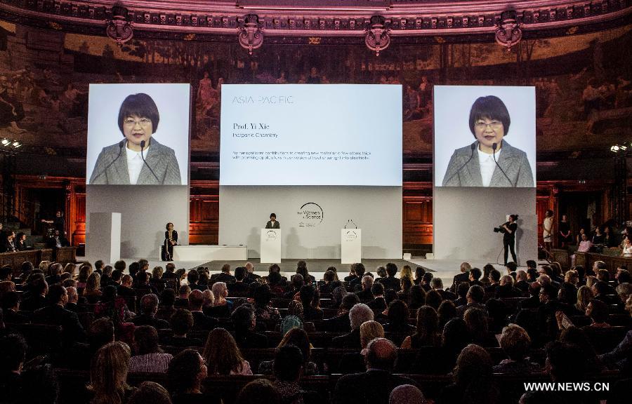 Yi Xie, professor at the University of Science and Technology of China, attends the ceremony of L'Oreal-UNESCO For Women in Science Awards 2015, in Paris, France, March 18, 2015. Yi Xie, professor at the University of Science and Technology of China, was on Wednesday honored with the L'Oreal-UNESCO For Women in Science Awards 2015, together with four other women for their ground-breaking discoveries in physical sciences. (Xinhua/Chen Xiaowei) |