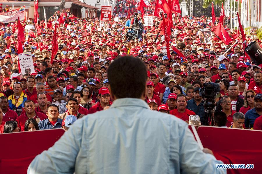 Venezuela's President Nicolas Maduro delivers a speech to oil and electrical workers in Caracas March 18, 2015. Nicolas Maduro said on Wednesday that his government would start a world campaign this week to demand U.S. President Barack Obama repeal his executive order declaring Venezuela as a "threat" to the U.S. national security. (Xinhua/Str) |