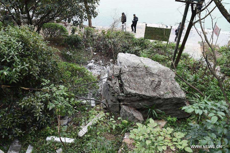Policemen check the incident site at a scenic spot in Guilin, southwest China's Guangxi Zhuang Autonomous Region, March 19, 2015. Seven people were killed and 19 others, including eight Taiwanese, were injured after a huge boulder fell off a mountain in Guilin Thursday morning. (Xinhua/Zhao Jiazhi) |