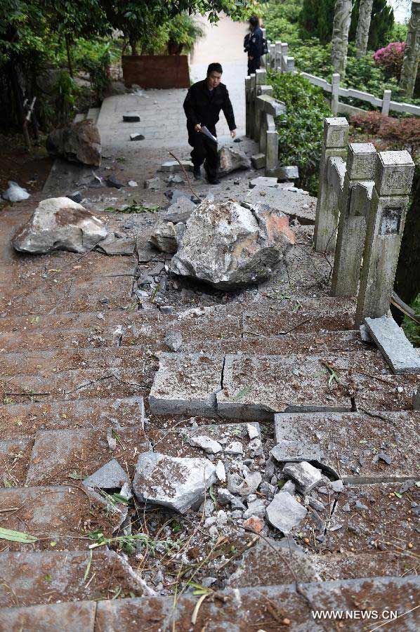 Policemen check the incident site at a scenic spot in Guilin, southwest China's Guangxi Zhuang Autonomous Region, March 19, 2015. Seven people were killed and 19 others, including eight Taiwanese, were injured after a huge boulder fell off a mountain in Guilin Thursday morning. (Xinhua/Zhao Jiazhi) |