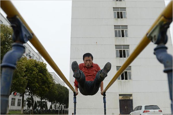 Gan plays parallel bars on campus. [Photo: Xinhua]
