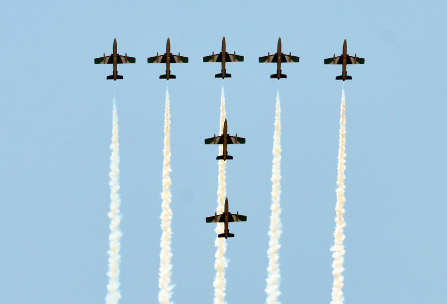 Bayi Aerobatic Team of the Air Force of the Chinese People's Liberation Army performs in LIMA on March 17, 2015. (Xinhua/Zhang Wenzong)