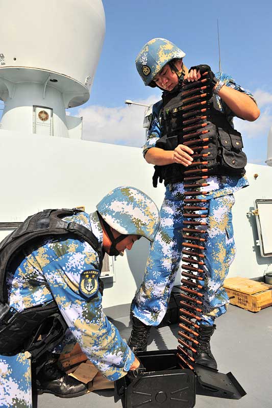 Two members of the special operation team put the machine gun bullets into the ammunition box. The special operation team of the 19th Chinese naval escort taskforce held the firing training on March 18. Each team member used multi-type guns in rotation such as the heavy machine gun, heavy sniper rifle and howitzer launcher to fire at the floating sea targets. (Photo: Chinamil.com.cn/Xiong Libing)