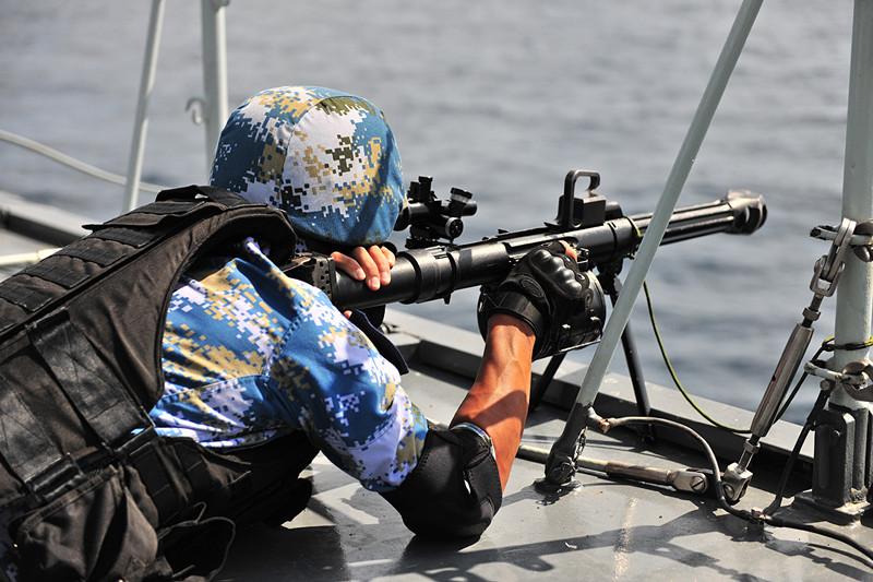 A soldier uses the howitzer launcher to fire at the sea targets. The special operation team of the 19th Chinese naval escort taskforce held the firing training on March 18. Each team member used multi-type guns in rotation such as the heavy machine gun, heavy sniper rifle and howitzer launcher to fire at the floating sea targets. (Photo: Chinamil.com.cn/Xiong Libing) |