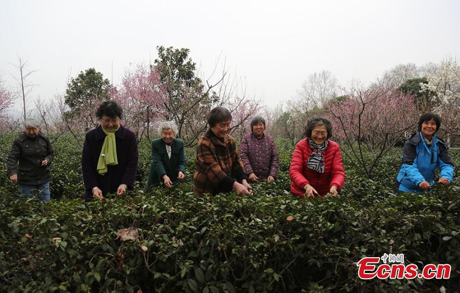 Women return to their old workplace 57 years after departing it to recollect their old days of picking tealeaves in the organic tea gardens of the Sun Yat-sen Mausoleum, Nanjing city, East China's Jiangsu province, March 19, 2015. (Photo: China News Service/ Gao Wei) |