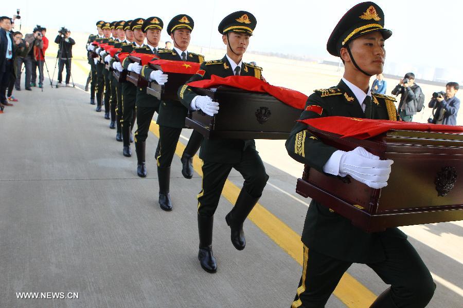 Soldiers of the Chinese People's Liberation Army carry coffins containing remains of soldiers of the Chinese People's Volunteers (CPV) dead in the 1950-53 Korean War, during a handover ceremony at the Inchon International Airport of South Korea, March 20, 2015. (Xinhua/Yao Qilin) |