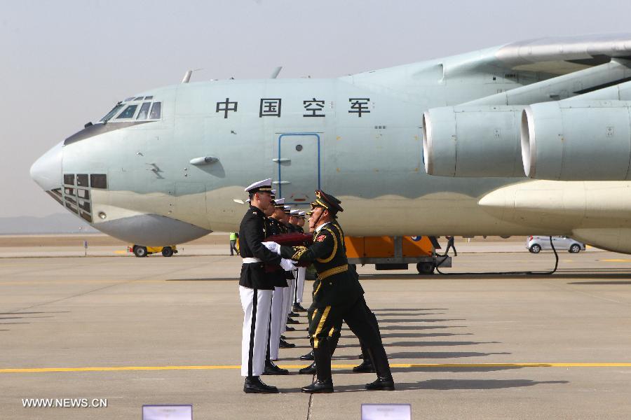 Soldiers of the Chinese People's Liberation Army (R) receive coffins containing remains of soldiers of the Chinese People's Volunteers (CPV) dead in the 1950-53 Korean War, during a handover ceremony at the Inchon International Airport of South Korea, March 20, 2015. (Xinhua/Yao Qilin) |
