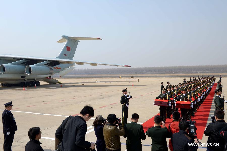 Soldiers of the Chinese People's Liberation Army carry coffins containing remains of soldiers of the Chinese People's Volunteers (CPV) dead in the 1950-53 Korean War, at the Taoxian International Airport in Shenyang, capital of northeast China's Liaoning Province, March 20, 2015. South Korea on Friday handed over to China the remains of 68 CPV soldiers dead in the Korean War. (Xinhua/Shen Ling) (wyo) |