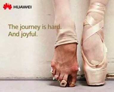 This is an advertising image used by Huawei for promotion. Its founder Ren Zhengfei explained the meaning behind the ad at the Davos Forum on Jan. 22, 2015. "This is the precise image of life at Huawei — it is hurtful and hard, but it's also joyful and happy. Huawei is like the feet. If we don't show them, everyone still thinks the 'feet' are fine."