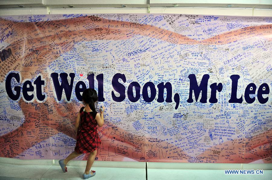 A little girl writes well-wishing messages for former Prime Minister Lee Kuan Yew at Singapore's Tanjong Pagar Community Club on March 22, 2015. Singapore's former prime minister Lee Kuan Yew has weakened further, the Prime Minister's Office (PMO) said on Sunday. (Xinhua/Then Chih Wey)