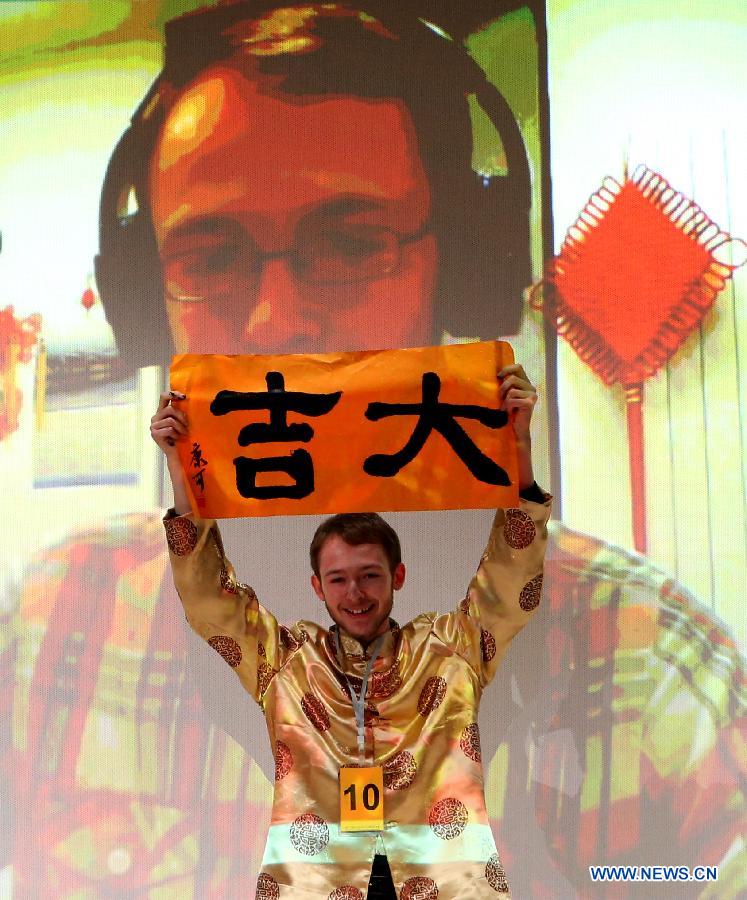 Cameron Patterson from Lancaster University performs during the final of the 14th "Chinese Bridge" Chinese Proficiency Competition UK 2015 held in British Library Conference Center in London, Britain, on March 21, 2015. (Xinhua/Han Yan)
