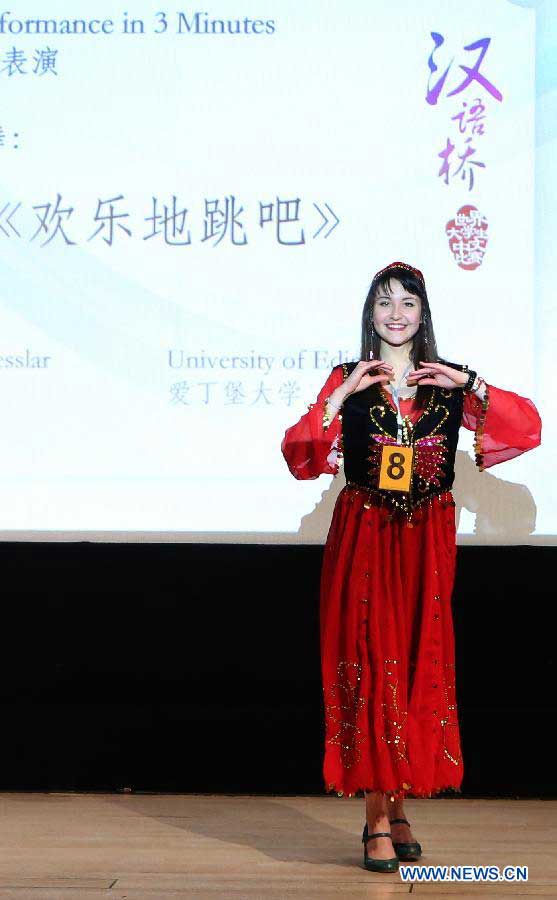 Riona Lesslar from University of Edinburgh performs during the final of the 14th "Chinese Bridge" Chinese Proficiency Competition UK 2015 held in British Library Conference Center in London, Britain, on March 21, 2015. (Xinhua/Han Yan)