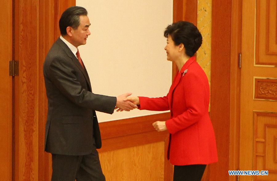 South Korean President Park Geun-hye (R) shakes hands with Chinese Foreign Minister Wang Yi during their meeting in Seoul, South Korea, on March 21, 2015. (Xinhua/Yao Qilin) |