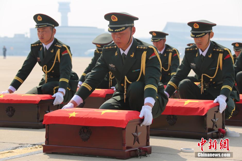The remains of 68 Chinese soldiers killed in the 1950-1953 Korean War arrive at at Shenyang Taoxian Airport, in northeast China's Liaoning Province on March 20, 2015. The remains were returned by the Republic of Korea on Friday, the second such repatriation following that of 437 Chinese soldiers in 2014. [Photo: Chinanews.com] |