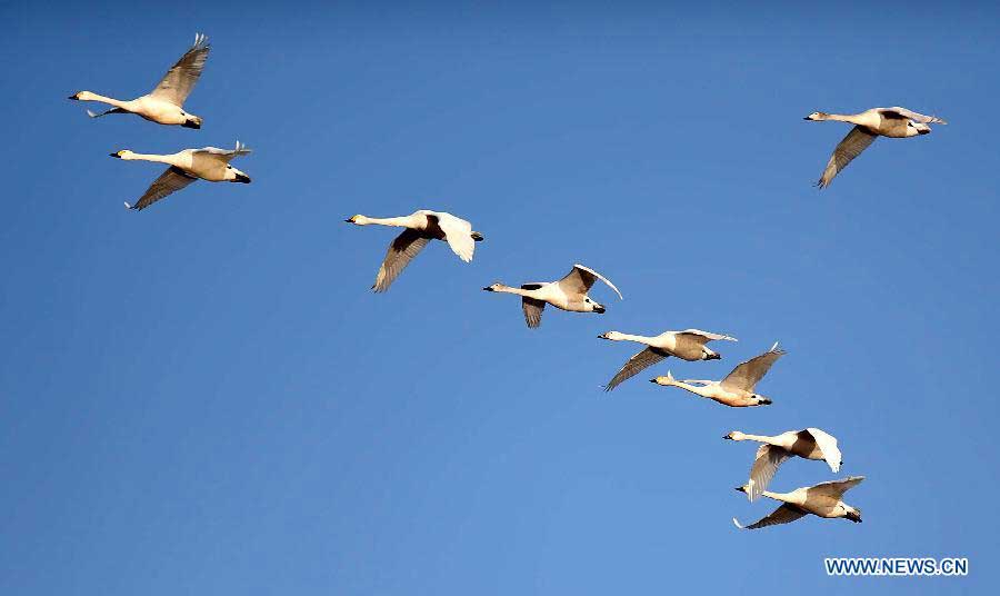 Swans fly in the sky in Dalate Banner, north China's Inner Mongolia Autonomous Region, March 22, 2015. Millions of migratory birds from southern China will rest here for about a month before they migrate to Siberia in Russia. (Xinhua/Ren Junchuan)