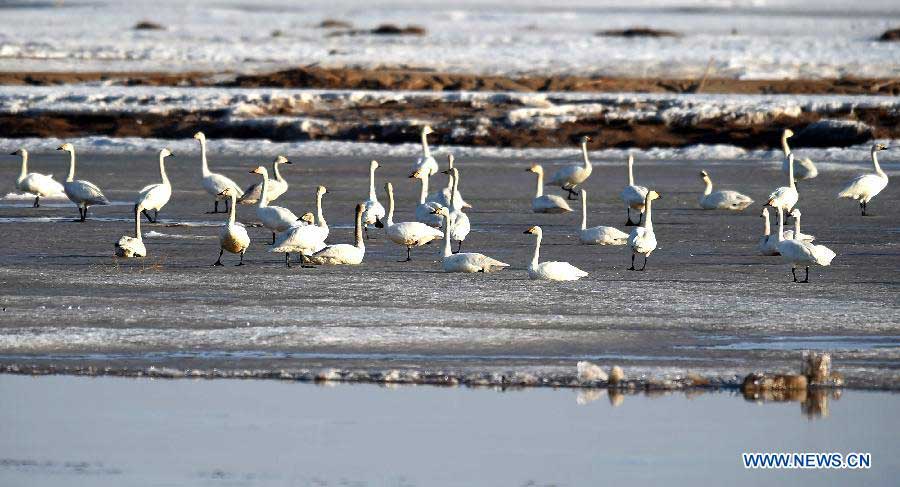 Swans rest over the Yellow River in Dalate Banner, north China's Inner Mongolia Autonomous Region, March 22, 2015. Millions of migratory birds from southern China will rest here for about a month before they migrate to Siberia in Russia. (Xinhua/Ren Junchuan)
