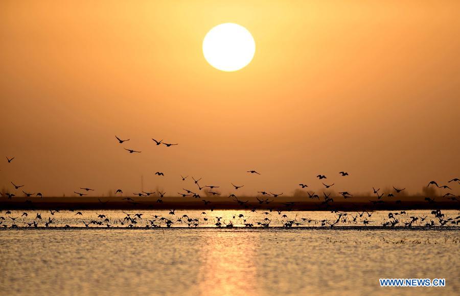 | Ducks are seen on the Yellow River in Dalate Banner, north China's Inner Mongolia Autonomous Region, March 23, 2015. Millions of migratory birds from southern China will rest here for about a month before they migrate to Siberia in Russia. (Xinhua/Ren Junchuan) |