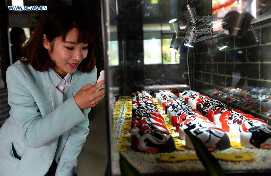 A visitor takes photos of facial makeup of Ganju Opera, one of the national intangible heritages, at the Ganju Opera museum in Nanchang, capital of east China's Jiangxi Province, March 22, 2015. China's first Ganju Opera museum, which introduced the origin, famous performers and development history of the traditional local opera, opened in Nanchang on Sunday. (Xinhua/Wan Xiang) |