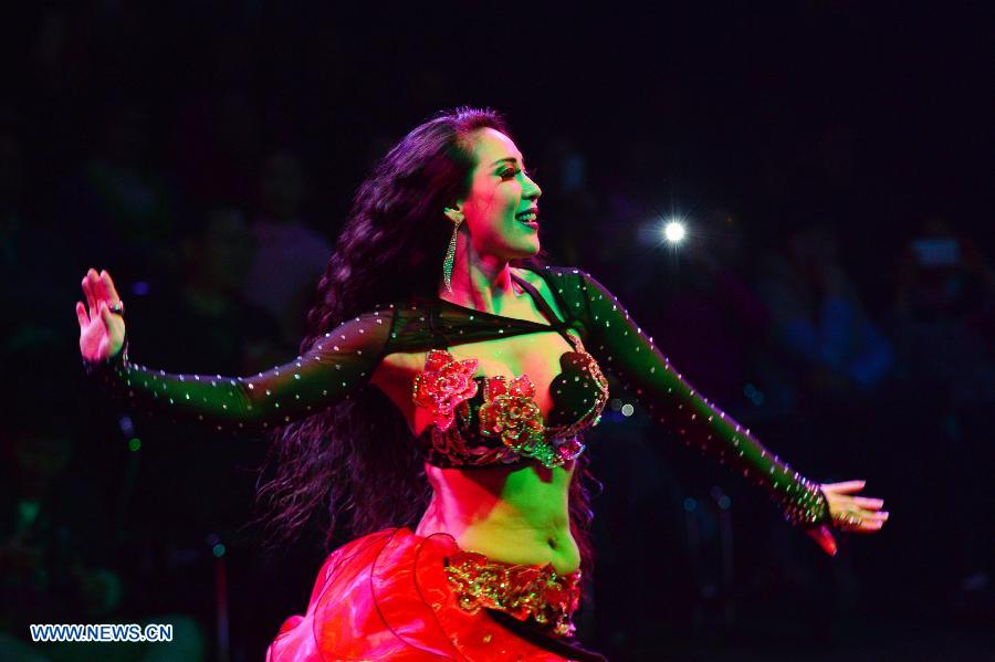 A dancer performs belly dance in Fuzhou, capital of southeast China's Fujian Province, March 22, 2015. Belly dance has become more and more popular among women in modern cities of China. (Xinhua/Wei Peiquan)