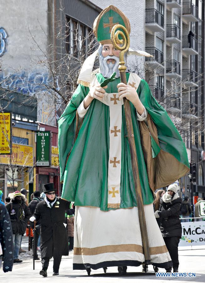 People celebrate the St. Patrick′s Day in downtown Montreal, Canada, March 22, 2015. (Xinhua/Andrew Soong)